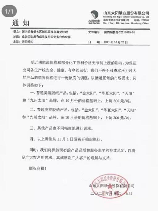 山東太陽紙業股份有限公司 從11月1日起,普通類銅版紙產品,包括“金太陽”、“華夏太陽”、“天陽”和“九州太陽”品牌在10月基礎上上調300元/噸;普通類雙膠紙產品,包括“金太陽”、“華夏太陽”、“天陽”和“九州太陽”品牌在10月基礎上上調300元/噸;其他產品也不同幅度地進行調漲。