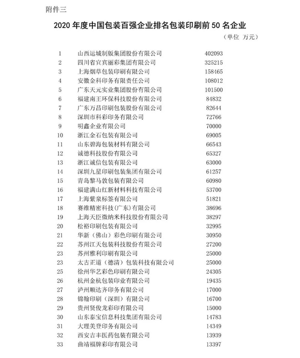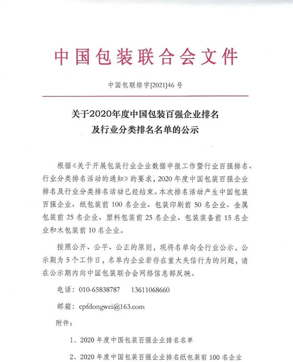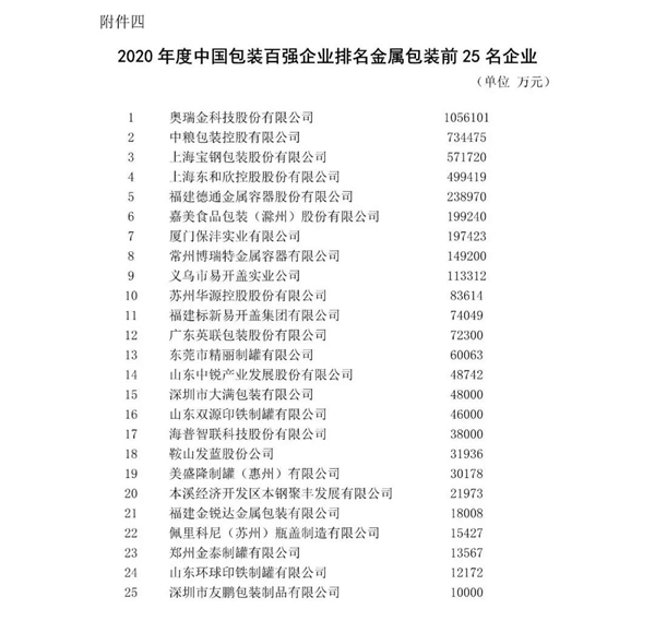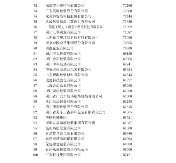 10月21日,中國包裝聯合會官網發布了《關于2020年度中國包裝百強企業排名及行業分類排名名單的公示》。根據《關于開展包裝行業企業數據申報工作暨行業百強排名、行業分類排名活動的通知》的要求,2020年度中國包裝百強企業排名及行業分類排名活動已經結束。本次排名活動產生中國包裝百強企業、紙包裝前100名企業、包裝印刷前50名企業、金屬包裝前25名企業、塑料包裝前25名企業、包裝裝備前15名企業和木包裝前10名企業。以下為具體內容: