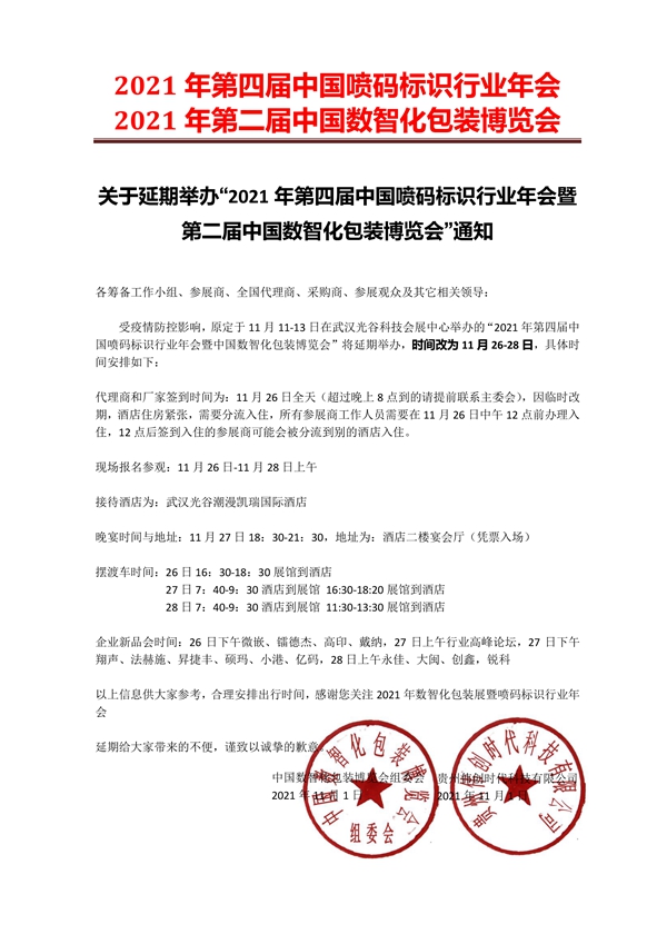 各籌備工作小組、參展商、全國代理商、采購商、參展觀眾及其它相關領導: 受疫情防控影響,原定于11月11-13日在武漢光谷科技會展中心舉辦的“2021年第四屆中國噴碼標識行業年會暨中國數智化包裝博覽會”將延期舉辦,時間改為11月26-28日,具體時間安排如下: 代理商和廠家簽到時間為:11月26日全天(超過晚上8點到的請提前聯系主委會),因臨時改期,酒店住房緊張,需要分流入住,所有參展商工作人員需要在11月26日中午12點前辦理入住,12點后簽到入住的參展商可能會被分流到別的酒店入住。 現場報名參觀:11月26日-11月28日上午 接待酒店為:武漢光谷潮漫凱瑞國際酒店 晚宴時間與地址:11月27日18:30-21:30,地址為:酒店二樓宴會廳(憑票入場) 擺渡車時間:26日16:30-18:30展館到酒店 27日7:40-9:30酒店到展館 16:30-18:20展館到酒店 28日7:40-9:30酒店到展館 11:30-13:30展館到酒店 企業新品會時間:26日下午微嵌、鐳德杰、高印、戴納,27日上午行業高峰論壇,27日下午翔聲、法赫施、昇捷豐、碩瑪、小港、億碼,28日上午永佳、大閩、創鑫,銳科 以上信息供大家參考,合理安排出行時間,感謝您關注2021年數智化包裝展暨噴碼標識行業年會 延期給大家帶來的不便,謹致以誠摯的歉意。
