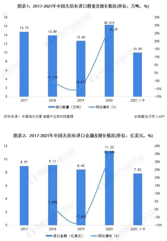 無紡布(又稱非織造布)是一種新型環保材料,具有防水、透氣、柔韌、無毒、無刺激、可降解、可折疊、手感柔軟、耐磨、顏色豐富多彩等特點,廣泛應用于農業、家用裝飾、工業、軍用、汽車行業、學校、辦公用品、衛生保健、休閑、旅行、服裝、土工布、居家用、個人衛生用品、建筑業等行業。 根據中國海關總署數據顯示,2017-2019年,我國無紡布進口數量呈現下降的態勢,進口額波動下降。2020年,受疫情的影響,國內無紡布市場亟劇增大,中國無紡布進口數量和金額均出現大幅增長。2020年,我國無紡布進口數量為16.29萬噸,同比增長28.61%;進口額為11.22億美元,同比增長33.24%。2021年1-9月,中國無紡布進口數量為10萬噸,進口額達到7.82億美元。