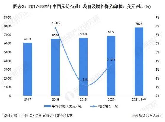01、我國無紡布進口均價呈上升態勢 雖然我國無紡布產量不斷擴大,已然成為全球無紡布供應大國,但無紡布主要還是以中低端產品為主,在高端產品上和全球領先企業仍有一定的差距。2017-2020年,我國無紡布進口均價從2017年的6088美元/噸上升至2020年的6890美元/噸,;2021年前三季度,我國無紡布進口均價漲至7825美元/噸。