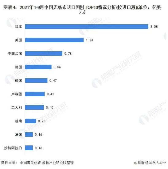 02、日本為我國無紡布的主要進口國 從我國無紡布制品進口國別來看,2021年1-9月,我國無紡布主要從日本進口,進口額高達2.58億美元;其次是美國,無紡布進口1.23億美元。