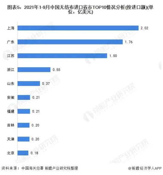 從進口省市來看,2021年1-9月,上海、廣東和江蘇是我國無紡布主要的進口地,其中上海無紡布進口金額達2.02億美元,位居第一;其次是廣東和江蘇,無紡布進口金額分別為1.76億美元和1.50億美元。