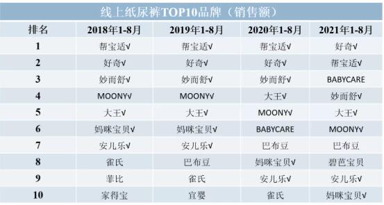 Early Data數據顯示,綜合阿里、京東兩大電商平臺,從TOP品牌來看,2018-2021年(1-8月)線上紙尿褲銷售額最高的10大品牌中,幫寶適、好奇、妙而舒、MOONY、大王、媽咪寶貝和安兒樂始終占據榜單,其中幫寶適、好奇、妙而舒、大王四年未跌出前五,近兩年線上紙尿褲品牌最大黑馬要數BabyCare,自2018年入局紙尿褲,堅定搶占高端市場,得益于過去沉淀用戶的紅利基數,快速增長并彎道超車。從數據可見,頭部紙尿褲品牌競爭格局相對穩定,新國貨品牌持續突圍。