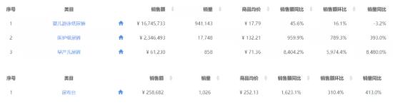 同時,一些極為細分且小眾的尿褲品類呈現高速增長,嬰兒游泳尿褲銷售額為1674.6萬,較去年同比增長45.6%;醫護級尿褲銷售額為234.65萬,同比增長959.9%;早產兒尿褲銷售額為6.12萬,同比增長8404.2%;嬰兒尿褲“周邊”用品尿布臺銷售額同比增長413%。作為兼具輕松更換紙尿褲的“神器”受到眾多寶媽的歡迎。