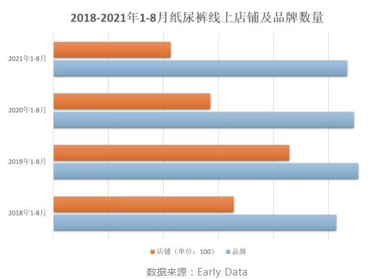 Early Data數據顯示,綜合阿里、京東兩大電商平臺,近年來線上紙尿褲品牌和店鋪數量在持續下降,自2019年1-8月年顯著增長,2020年1-8月線上紙尿褲店鋪數量大幅減少(-33.6%),今年1-8月延續跌勢(-25.2%)。從數據走勢可以看出,隨著行業洗牌期的來臨,線上紙尿褲市場正在淘汰競爭力較弱的店鋪和品牌,中小規模且自有生產線與產品品質匱乏的企業或將首當其沖。