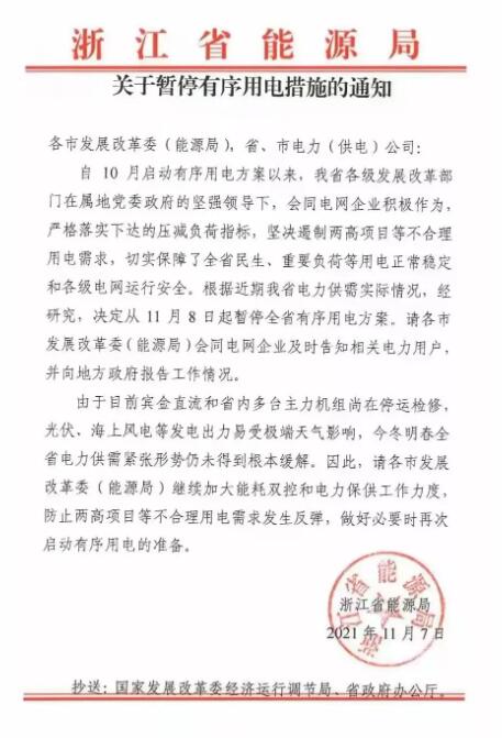 國家電網有限公司消息:經過各方的共同努力,有序用電規模明顯減少。截至11月6日,除個別省份、局部時段對高耗能、高污染企業采取有序用電措施外,全網有序用電規模接近清零。這也意味著,9月份以來的全國性限電情況,基本結束! 以下為報道全文: 黨中央、國務院高度重視今冬明春能源保供工作,國家發展改革委、國務院國資委、能源局等有關部門提出明確要求,對煤電油氣運等全方面加強工作部署,多措并舉,促進煤炭增產增供、平抑煤炭價格、電力多發滿發、天然氣增產增儲,地方黨委政府、能源企業等有關方面積極配合,全力保障能源安全穩定供應,有效緩解能源供需緊張形勢。 國家電網公司堅決扛起電網責任,強化政治擔當,落實落細措施,千方百計,綜合施策,從發、供、用多向發力,全力以赴保安全、保供電、保民生、保重點,扎實做好今冬明春電力保供工作。 一是支撐各類電源增發穩供。密切跟蹤電煤、燃氣供應,挖掘發電潛力,協調燃煤、燃氣等各類機組能開盡開、多發滿發。 二是充分發揮大電網平臺作用。科學安排電網運行方式,利用跨區跨省輸電通道,統籌協調全網電力電量平衡,加強電力余缺互濟,確保電網安全。 三是堅決守住民生用電底線。堅持“需求響應優先、有序用電保底、節約用電助力”,積極配合政府細化完善有序用電方案,引導用戶錯峰避峰,全力保障居民、公共服務和重要用戶用電。 四是認真落實電價改革政策。有序放開全部燃煤發電電量上網電價,擴大市場交易電價上下浮動范圍,積極開展代理購電,全面做好客戶告知、市場注冊、代理協議簽訂、計量表計升級等工作。 五是強化全社會節能節約意識。推動低碳節能生產和改造,抑制不合理用電需求,促進節能降耗,引導全社會形成綠色生產生活方式。 經過各方的共同努力,目前國家電網經營區域電力供需形勢恢復常態,保供電保民生取得階段性成效。電煤供應明顯增加。 公司經營區電煤庫存回升至9932萬噸,電煤可用天數回升至20天。并網發電能力明顯提高。公司經營區故障搶修煤電機組和煤電受阻容量雙雙下降,實現應并盡并、應發盡發,煤電機組發電能力大幅提升。有序用電規模明顯減少。 全網最大有序用電規模大幅下降,電力缺口明顯縮小。 截至11月6日,除個別省份、局部時段對高耗能、高污染企業采取有序用電措施外,全網有序用電規模接近清零。 目前電力保供取得了階段性成效,但隨著迎峰度冬臨近,用電高峰期、冬季供暖期、水電枯水期三期疊加,今冬明春全網呈現“總體緊平衡、局部有缺口”的局面,電力保供大戰大考還在繼續。 國家電網公司將進一步增強責任感緊迫感,完整準確全面貫徹新發展理念,服務碳達峰、碳中和目標,踐行人民電業為人民的企業宗旨,守牢電網安全生命線,守住民生用電底線,堅決打贏打好今冬明春電力保供這場硬仗,確保經濟社會平穩運行,確保人民群眾溫暖過冬,為服務經濟社會發展大局作出積極貢獻。 浙江:全省取消限電 7日,浙江省能源局發布《關于暫停有序用電措施的通知》,《通知》稱,根據近期電力供需實際情況,經研究,決定從11月8日起全省暫停有序用電。