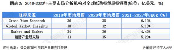1、全球紙漿模塑市場(chǎng)規(guī)模超過(guò)30億美元 根據(jù)綜合全球知名市場(chǎng)分析機(jī)構(gòu)對(duì)紙漿模塑包裝市場(chǎng)的研究,Grand View Research分析2020年全球紙漿模塑包裝行業(yè)的市場(chǎng)規(guī)模在38億美元,未來(lái)7年將保持6.1%的增速,而Global Market Insights則認(rèn)為全球紙漿模塑規(guī)模在32億美元,未來(lái)7年將保持5.1%的增速。前瞻綜合全球三家知名行業(yè)研究企業(yè)對(duì)全球紙漿模塑包裝行業(yè)的市場(chǎng)規(guī)模分析,初步統(tǒng)計(jì)2020年全球紙漿模塑包裝行業(yè)市場(chǎng)規(guī)模為35億美元,2021-2027年市場(chǎng)年均復(fù)合增速為5.2%。