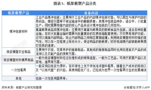 紙漿模塑制品為根據(jù)不同的用途制成各種形狀的模型制品,多是用于各類(lèi)產(chǎn)品的輔助性具有保護(hù)功能的材料,一般主要包括緩沖包裝材料、紙漿模塑農(nóng)業(yè)制品、紙漿模塑材料模塑制品、一次性餐具及其他,具體如下: