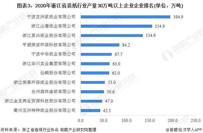 具體到企業(yè)來(lái)看,2020年,全省產(chǎn)量在30萬(wàn)噸以上企業(yè)有11家,其中寧波亞洲漿紙業(yè)以194.9萬(wàn)噸的產(chǎn)量位居全省第一;浙江山鷹紙業(yè)和浙江景興紙業(yè)緊隨其后,分列二三位,紙及紙板產(chǎn)量分別為154.9萬(wàn)噸和134.9萬(wàn)噸。