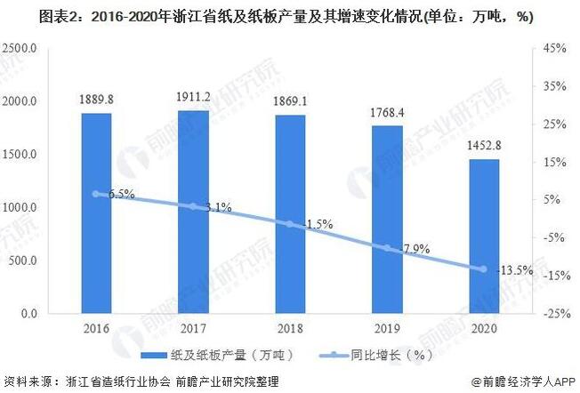 從產(chǎn)量規(guī)模變化來(lái)看,2016年以來(lái),浙江紙及紙板產(chǎn)量呈現(xiàn)先升后降的變化趨勢(shì),2017年浙江省紙及紙板產(chǎn)量為1911.2萬(wàn)噸,創(chuàng)近年新高。 2018年以來(lái),隨著浙江環(huán)保政策變化,主要紙制品產(chǎn)量有所下滑,2020年浙江造紙行業(yè)在逆境中謀發(fā)展,以供給側(cè)結(jié)構(gòu)調(diào)整為重點(diǎn),以創(chuàng)新引領(lǐng)產(chǎn)業(yè)深度發(fā)展,全年生產(chǎn)紙及紙板產(chǎn)品1452.8萬(wàn)噸,同比下降13.5%,產(chǎn)量規(guī)模創(chuàng)近五年最低值。