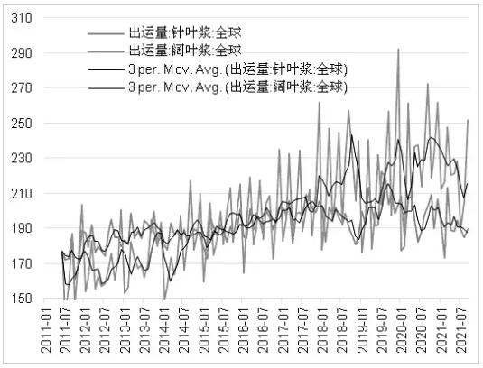 △圖為全球針葉漿、闊葉漿產(chǎn)能增長(zhǎng)率 2022年年初形成階段性供應(yīng)增量 紙漿出運(yùn)量也可能改變供應(yīng)節(jié)奏。針葉漿出運(yùn)量受兩大因素的影響: 第一,闊葉漿對(duì)運(yùn)力的爭(zhēng)奪。2017—2020年,全球針葉漿和闊葉漿出運(yùn)量出現(xiàn)此消彼長(zhǎng)現(xiàn)象,二者反向波動(dòng)。不過(guò),這一現(xiàn)象在2021年發(fā)生改變,當(dāng)年針葉漿與闊葉漿出運(yùn)量均有減少。究其原因,是全球海運(yùn)能力下降造成的。總量的減少掩蓋了二者爭(zhēng)奪運(yùn)力的本質(zhì)。展望2022年,闊葉漿新增裝置較多,需要更強(qiáng)的物流力量,無(wú)論海運(yùn)能力是否回升,針葉漿出運(yùn)量的增幅都是有限的。