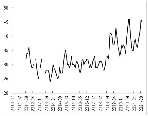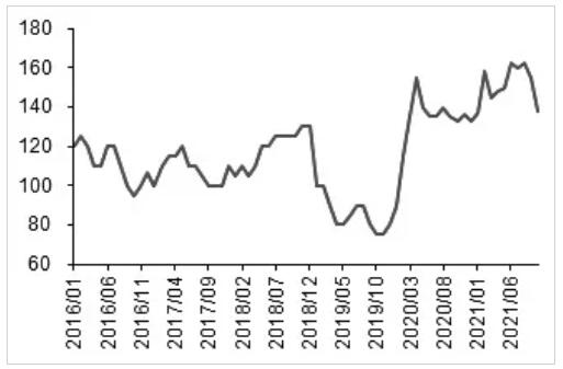△圖為全球針葉漿、闊葉漿出運(yùn)量 第二,針葉漿庫(kù)存水平達(dá)到高位。截至2021年9月,全球針葉漿廠家?guī)齑嫣鞌?shù)已到45天,為有數(shù)據(jù)記錄的10年來(lái)的最高水平。漿廠去庫(kù)迫在眉睫,且去庫(kù)壓力的釋放一定會(huì)伴隨出運(yùn)量的階段性增加。從2020年8月類似的情況看,針葉漿可能出現(xiàn)3—6個(gè)月的出運(yùn)量邊際走高。可以預(yù)計(jì),2022年年初針葉漿的供應(yīng)勢(shì)必放量。