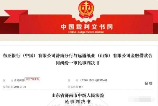 據判決書顯示,2018年遠通紙業與東亞銀行簽訂協議,承兌25份電子銀行承兌匯票,總金額為6000萬元,截至2020年12月15日,遠通紙業公司欠付墊款本金39444686.99元、利息1660403.73元; 2019年9月26日,馬來亞銀行與遠通紙業簽訂《短期貸款重述貸款協議》,欠馬來亞銀行貸款本金51130000元,以及相關利息、違約利息及其他費用;