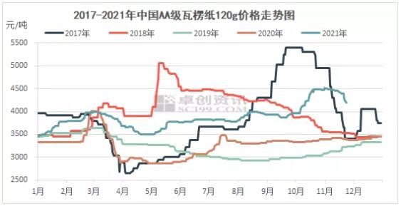 2017-2021年瓦楞及箱板紙市場(chǎng)呈“沖高-寬幅震蕩-蓄力上行”的態(tài)勢(shì),其中2017年受禁廢令影響,瓦楞及箱板紙價(jià)格一度攀升,其中瓦楞紙達(dá)到5400元/噸,箱板沖破6000元/噸大關(guān),形成了箱板紙市場(chǎng)的天花板;2018-2020年價(jià)格寬幅震蕩,主要受中美貿(mào)易摩擦及公共衛(wèi)生事件影響;2021年,受外廢進(jìn)口清零,加之全球通脹大環(huán)境,國內(nèi)“十四五”、雙碳政策的大背景,加上能源、廢紙等成本增加,整體價(jià)格處于上行通道。 瓦楞紙及箱板紙市場(chǎng)概述 2021年瓦楞紙及箱板紙市場(chǎng)處于平穩(wěn)發(fā)展階段,隨著規(guī)模紙企新增項(xiàng)目的投產(chǎn),瓦楞及箱板紙產(chǎn)能集中度有上升勢(shì)頭,從供需格局來看,2021年瓦楞及箱板紙供應(yīng)略大于需求,箱板紙較瓦楞紙供應(yīng)壓力凸顯。2022-2023年箱板紙產(chǎn)能集中投放,供應(yīng)壓力有繼續(xù)增加趨勢(shì)。 從生產(chǎn)特點(diǎn)來看,瓦楞紙生產(chǎn)企業(yè)相較箱板紙分散,其中規(guī)模紙企多具備瓦楞及箱板紙均可生產(chǎn)的能力,國內(nèi)最大紙企瓦楞及箱板紙產(chǎn)能達(dá)到近2000萬噸,生產(chǎn)企業(yè)分布在華南、華東、華北等沿海地區(qū)。受到近幾年政策面及原料面影響,紙廠新增項(xiàng)目往廣西、湖北、貴州等地延伸。 瓦楞紙及箱板紙價(jià)格趨勢(shì)分析 2021年瓦楞紙市場(chǎng)走勢(shì)呈現(xiàn)“漲—降—漲-降”的走勢(shì),整體市場(chǎng)偏強(qiáng)運(yùn)行。據(jù)卓創(chuàng)資訊數(shù)據(jù)監(jiān)測(cè):截至11月24日,中國AA級(jí)瓦楞紙120g市場(chǎng)均價(jià)在3882元/噸,同比上漲18.47%。其中高點(diǎn)出現(xiàn)在10月4494元/噸,低點(diǎn)出現(xiàn)在年初3474元/噸,高低價(jià)差在1020元/噸,波幅達(dá)到29.36%。影響紙價(jià)的主要因素有:首先,原料供應(yīng)緊張,帶動(dòng)成本增加。其次,規(guī)模紙廠政策導(dǎo)向明顯,對(duì)市場(chǎng)價(jià)格走向起到指引作用。再次,受全球公共衛(wèi)生事件反復(fù)影響,2021年整體船運(yùn)較為緊張,且海運(yùn)費(fèi)及國外瓦楞紙價(jià)格增加,國內(nèi)外套利空間減少,因此進(jìn)口量較少,對(duì)國內(nèi)紙價(jià)沖擊較小。最后,2021年是“十四五”規(guī)劃開局之前,煤改氣、碳中和、碳達(dá)峰等政策實(shí)施,亦是影響紙價(jià)走勢(shì)的重要因素。
