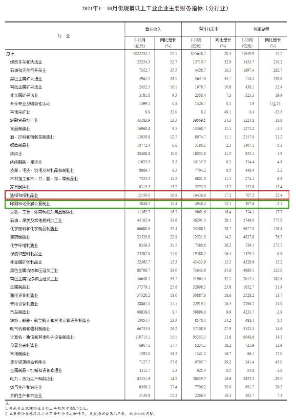 1—10月份,規模以上工業企業實現營業收入102.22萬億元,同比增長21.1%;發生營業成本85.56萬億元,增長20.3%;營業收入利潤率為7.01%,同比提高1.04個百分點。其中,造紙和紙制品業實現營業收入12159.0億元,同比增長16.8%;印刷和記錄媒介復制業實現營業收入5846.5億元,同比增長11.4%。