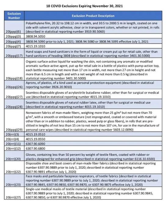 這意味著,有18項產品在2021年11月30日排除有效期到期后,將恢復加征301關稅,無法繼續豁免加征,包括當前我國熱門出口商品——紡織品口罩、部分洗手液、一次性手套等。