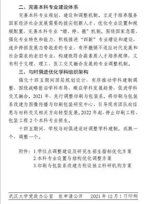 真的假的,武漢大學(xué)將撤銷印刷與包裝系,雙一流高校中的唯一專業(yè)。 近日,武漢大學(xué)將撤銷印刷與包裝系,印刷與包裝系為武漢大學(xué)直屬系,是國家首批“211工程”重點(diǎn)建設(shè)學(xué)科及國家“985工程”特色與交叉學(xué)科的建設(shè)單位,而且是目前“雙一流”建設(shè)高校中唯一設(shè)置印刷工程、包裝工程本科專業(yè)的獨(dú)立建制院系。 武漢大學(xué)強(qiáng)化十四五期間頂層規(guī)劃設(shè)計,有序推動學(xué)科建制調(diào)整,圍繞戰(zhàn)略前沿學(xué)科布局,順應(yīng)學(xué)科發(fā)展趨勢,促進(jìn)學(xué)科交叉融合。2021年,先行調(diào)整印刷與包裝系。將印刷與包裝系改建為圖像傳播與印刷包裝研究中心,引導(dǎo)現(xiàn)有團(tuán)隊向信息與材料交叉相關(guān)方向轉(zhuǎn)型發(fā)展。2022年起,停止印刷工程,包裝工程2個本科專業(yè)招生。 在撤銷文件中是這樣說明的:將印刷與包裝系改建為校設(shè)獨(dú)立科研機(jī)構(gòu):圖像傳播與印刷包裝研究中心(簡稱印包中心)。印包中心將向信息、材料、數(shù)字交叉方向轉(zhuǎn)型。印包中心由科學(xué)技術(shù)發(fā)展研究院根據(jù)相關(guān)規(guī)定負(fù)責(zé)歸口管理。原則上,印刷與包裝系相應(yīng)辦學(xué)資源要素隨學(xué)生、教師調(diào)整至印包中心等單位。 2022年起,停止印刷工程、包裝工程本科專業(yè)招生。待在校印刷工程、包裝工程本科生畢業(yè)(2025年)后,撤銷印刷工程、包裝工程本科專業(yè)。 2023年起,停止輕工技術(shù)與工程一級學(xué)科碩士研究生招生。過渡期(2022-2025)內(nèi),保留輕工技術(shù)與工程學(xué)位點(diǎn)。 印刷工程畢業(yè)的小伙伴介紹說,多年前就已經(jīng)轉(zhuǎn)行,冷門到考公務(wù)員專業(yè)都審不過,感覺讀了一個假大學(xué),公共課外,學(xué)了化學(xué)物理機(jī)械電子技術(shù)顯示技術(shù)色彩管理平面設(shè)計計算機(jī)圖形學(xué)網(wǎng)頁設(shè)計……到頭來啥啥也不會。 而這個專業(yè)的分?jǐn)?shù)是武漢大學(xué)的最低錄取分?jǐn)?shù)線,一些為了考名校,沖一沖的考生壓線進(jìn)入武漢大學(xué),結(jié)果這個專業(yè)有點(diǎn)坑,找工作難。 一些小伙伴對這個專業(yè)的撤銷表示歡迎,又少了一個填坑專業(yè),小伙伴,你們的意見呢?