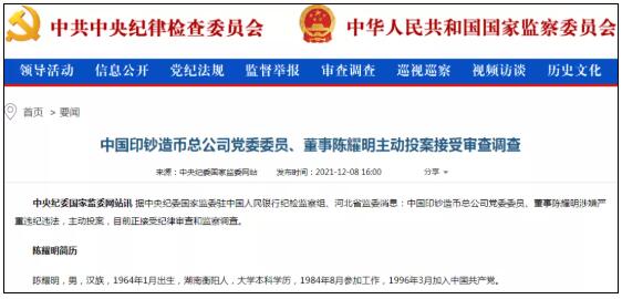 出任黨委委員、董事不到一年,中國印鈔造幣總公司陳耀明被查! 中國印鈔造幣總公司董事陳耀明主動投案 12月8日,中央紀委國家監委網站通報,據中央紀委國家監委駐中國人民銀行紀檢監察組、河北省監委消息,中國印鈔造幣總公司黨委委員、董事陳耀明涉嫌嚴重違紀違法,主動投案,目前正接受紀律審查和監察調查。