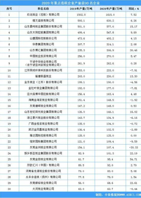 中國造紙業(yè)協(xié)會公布《中國造紙工業(yè)2020年度報告》。榜單根據(jù)2020年各造紙企業(yè)年產(chǎn)量進行排名。其中20年產(chǎn)量排名第一的是玖龍紙業(yè),為1615萬噸,同比增長7.52%;其次是理文造紙,為630.2萬噸,與第一的玖龍紙業(yè)產(chǎn)量有近乎1000萬噸之差;排名第三的是山東晨鳴紙業(yè),為577萬噸,同比增長15.17%。隨后依次是山東太陽、山鷹國際、華泰集團、山東博匯、中國紙業(yè)、寧波中華、江蘇榮成。