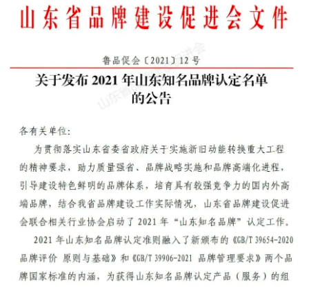 山東知名品牌的認定是為貫徹落實山東省委省政府關于實施新舊動能轉換重大工程的精神要求,助力質量強省、品牌戰略實施和品牌高端化進程,引導建設特色鮮明的品牌體系,培育具有較強競爭力的國內外高端品牌;是由山東省品牌建設促進會聯合相關行業協會根據《山東知名品牌認定管理辦法》的規定,經組織申報、資格審查、大數據信息挖掘、信息化系統平臺評審、專家評審、專家委員會審議、認定委員會認定等工作程序,推出山東知名品牌擬認定名單。