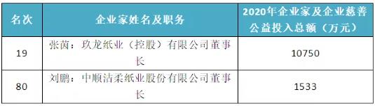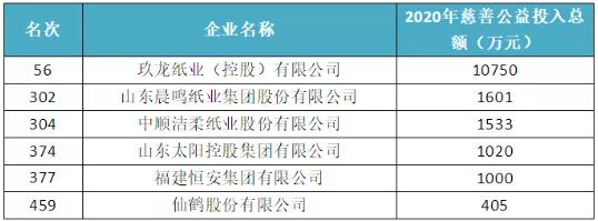 (2021中國慈善企業家名單) 以上榜單全面客觀地向全社會展示了中國造紙企業慈善公益成就,引領激勵著更多的造紙企業加大慈善公益投入,為我國的鄉村振興、抗疫復工、抗洪救災和經濟社會發展等發揮了重要作用。 入圍以上榜單不僅僅只是榮譽,更是一份沉甸甸的責任。造紙企業應當不忘初心、牢記使命,積極參與各類公益事業,努力成為擔當企業社會責任、增進人民幸福生活的有力踐行者!