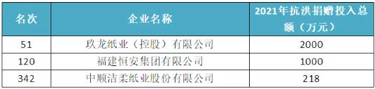 2021年12月18日,以“財富與責任——企業的價值”為主題第五屆中國企業慈善公益論壇在涪陵舉行。 會上發布了2021中國企業慈善公益500強、中國企業抗洪捐贈500強、中國慈善企業家、中國十大最受尊敬企業和中國十大愛心扶殘企業名單,多家造紙企業上榜。