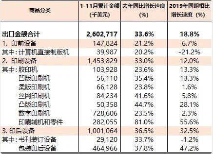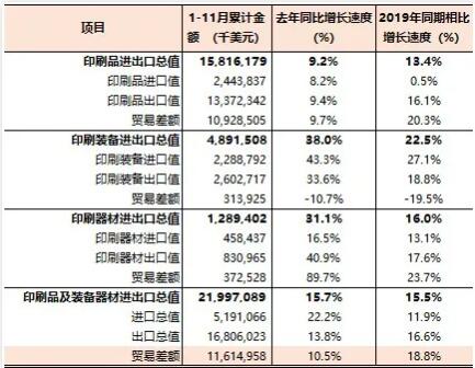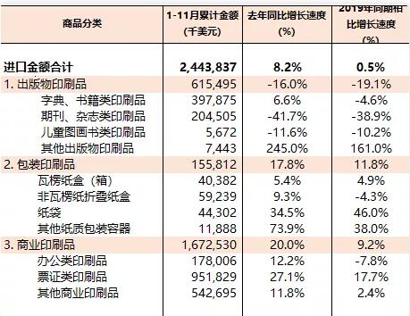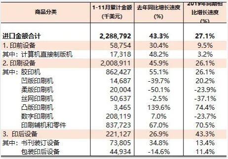 同期,國內印刷器材進出口貿易順差3.73億美元(同比增長89.7%、比2019年同期增長23.7%)。 本期觀察 總結: 2021年1-11月國內印刷產業相關商品進出口呈現已下特點: 印刷品、印刷裝備、印刷器材三大類商品進出口繼續保持增長。與去年同期相比,印刷品進出口增長9.2%、印刷裝備進出口增長38.0%、印刷器材進出口增長31.1%。但與上期數據相比,除印刷裝備進出口增長速度大幅下降(下降5.2個百分點)外、印刷品和印刷器材進出口增長速度保持基本穩定; 印刷品進口增長乏力、出口增長穩定。盡管本期國內印刷品進口與去年同期相比有8.2%的增長,但其進口規模與2019年同期基本持平;而國內印刷品出口同比增長9.4%,與2019年同期相比增長16.1%; 印刷裝備進口、出口同步增長,且進口增長速度大于其出口增長速度。與去年同期相比,國內印刷設備進口增長43.3%、出口增長33.6%;與2019年同期相比,其進口增長27.1%、出口增長18.8%。國內印刷裝備進口和出口規模不僅超越去年同期水平,且比2019年同期也有較大幅度增長; 印刷器材進口、出口持續增長,其出口同比增長速度遠遠大于其進口增長速度。與去年同期相比,國內國內印刷器材進口增長16.5%、出口增長40.9%。與2019年同期相比,其進口增長13.1%、出口增長17.6%。與上期數據相比,印刷器材進口與出口增長速度的差距還在擴大。 與去年同期相比,2021年1-11月國內印刷品、印刷裝備、印刷器材進口、出口增長較快的前五位商品類別如下: 進口:其他出版物印刷品(+245.0%)、凸版印刷機(+139.6%)、CTP膠印版材(+103.3%)、其他紙質包裝容器(+73.9%)、印刷輔機和零件(+67.0%); 出口:印刷輔機和零件(+81.0%)、票證類印刷品(+72.6%)、CTP膠印版材(+46.6%)、凸版印刷機(+44.7%)、絲印機(+41.6%)。 同期,國內印刷品、印刷裝備、印刷器材進出口相對萎縮的商品類別如下: 進口:柔版印刷機(-50.1%)、期刊雜志類印刷品(-41.7%)、凹版印刷機(-39.7%)、包裝印后設備(-14.6%)、兒童圖畫書類印刷品(-11.6%); 出口:其他商業類印刷品(-25.9%)、辦公類印刷品(-5.1%)。 另外,本期國內凹版印刷機和包裝印后設備進口增長速度(與去年同期相比)由正轉負。 與2019年同期相比,2021年1-11月國內印刷品、印刷裝備、印刷器材進口、出口增長較快的前五位商品類別如下: 進口:CTP膠印版材(+166.3%)、其他出版物印刷品(+161.0%)、凸版印刷機(+74.4%)、印刷輔機和零件(+70.5%)、紙袋(+46.0%)其他紙質包裝容器(+38.0%); 出口:其他紙質包裝容器(+56.4%)、印刷輔機和零件(+55.6%)、水性噴墨墨水(+55.2%)、瓦楞紙盒(箱)(+51.2%)、非瓦楞紙折疊紙盒(+50.3%)、包裝印后設備(+47.2%)。 同期,國內印刷品、印刷裝備、印刷器材進出口相對萎縮的商品類別如下: 進口:期刊雜志類印刷品(-38.9%)、絲印機(-37.1%)、柔版印刷機(-23.9%)、數字印刷機(-23.7%)、兒童圖畫書類印刷品(-10.2%); 出口:其他出版物印刷品(-33.3%)、期刊雜志類印刷品(-22.9%)、計算機直接制版機(-21.2%)、辦公類印刷品(-11.8%)、PS膠印版材(-11.3%)。 對比以往幾期數據發現,國內印刷品、印刷裝備、印刷器材三大類商品中,涉及進口、出口變動幅度較大的子項商品保持相對穩定。
