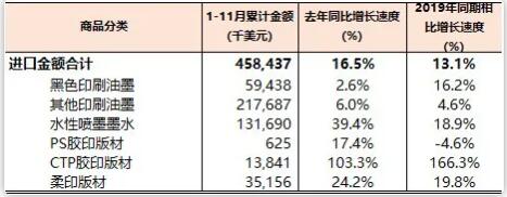 同期,國內印刷裝備進出口貿易順差3.14億美元(同比下降10.7%、比2019年同期下降19.5%)。 國內印刷器材進出口概況 2021年1-11月國內印刷器材進口4.58億美元(參見表6),同比增長16.5%、比2019年同期增長13.1%。其中,黑色印刷油墨1797.02噸、5943.8萬美元(同比增長2.6%、比2019年同期增長16.2%)、其他印刷油墨8018.87噸、2.18億美元(同比增長6.0%、比2019年同期增長4.6%)、水性噴墨墨水6712.49噸、1.32億美元(同比增長39.4%、比2019年同期增長18.9%)、PS膠印版材3.15萬平方米、62.5萬美元(同比增長17.4%、比2019年同期下降4.6%)、CTP膠印版材313.17萬平方米、1384.1萬美元(同比增長103.3%、比2019年同期增長166.3%)、柔印版材67.07萬平方米、3515.6萬美元(與上年增長24.2%、比2019年同期增長19.8%)。 表6 2021年1-11月 國內印刷器材進口統計