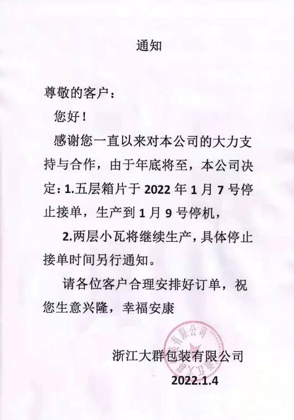 2022年1月4日,一份包裝企業(yè)的通知函在業(yè)內(nèi)引起不小議論。該企業(yè)宣布,五層箱片于1月7日停止接單,生產(chǎn)到1月9日停機;兩層小瓦將繼續(xù)生產(chǎn),具體停單時間另行通知。如無意外,這或許是業(yè)內(nèi)最早停止生產(chǎn)部分訂單的包裝企業(yè)。