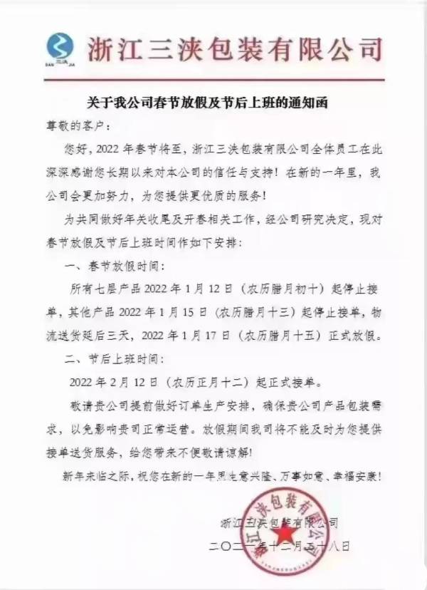 步入2022年后,發(fā)布春節(jié)放假通知函的包裝企業(yè)逐步增多。慈溪福山紙業(yè)橡塑有限公司、浙江方平紙業(yè)有限公司、寧波六和包裝有限公司/寧波日和新材料有限公司等企業(yè),也明確了停止接單、生產(chǎn)線停機、節(jié)前放假及節(jié)后上班時間。