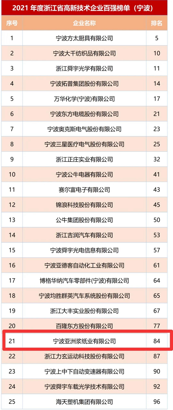 元旦前夕,從寧波市科技局傳來消息,2021年度浙江省高新技術(shù)企業(yè)創(chuàng)新能力百強和各領(lǐng)域十強榜單日前發(fā)布,寧波亞洲漿紙業(yè)榮登“2021年度浙江省高新技術(shù)企業(yè)創(chuàng)新能力百強榜”第84位,連續(xù)第二年入圍百強榜。寧波25家企業(yè)入圍,北侖區(qū)擁有8家,位列全省第二。寧波亞漿多年來堅持科技引領(lǐng)、創(chuàng)新發(fā)展,尤其在數(shù)字化轉(zhuǎn)型、智能制造方面,以市場為導(dǎo)向,以新品研發(fā)品牌建設(shè)為抓手,以四輪驅(qū)動科技創(chuàng)新為動力,不斷推進公司高質(zhì)量發(fā)展。