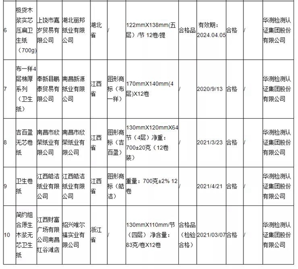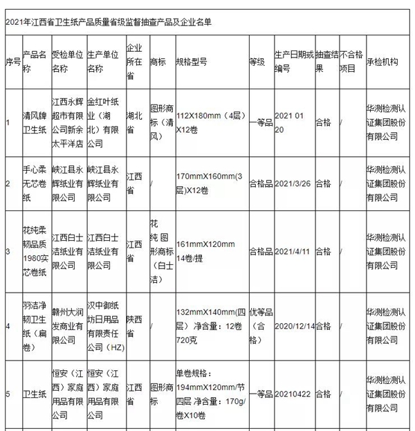 據江西省市場監督管理局網站2021年12月31日消息,2021年,江西省市場監督管理局對全省衛生紙產品質量進行了監督抽查。本次抽查了10批次衛生紙產品,經檢驗,全部合格。 本次監督抽查依據GB/T 20810-2018《衛生紙(含衛生紙原紙)》、GB 15979-2002《一次性使用衛生用品衛生標準》等標準要求,對可遷移熒光性物質(僅原生漿衛生紙)、橫向吸液高度(成品層)、抗張指數(縱橫向)、塵埃度、洞眼、灰分、D65亮度(亮度)、大腸菌群、細菌菌落總數、金黃色葡萄球菌、溶血性鏈球菌等11個項目進行了檢驗。