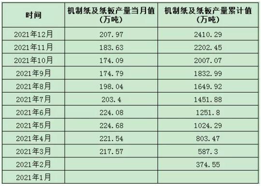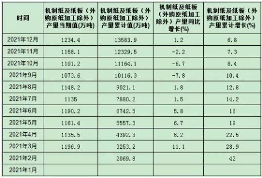 據(jù)國家統(tǒng)計(jì)局最新數(shù)據(jù)顯示,2021年1-12月,全國機(jī)制紙及紙板產(chǎn)量13583.9萬噸,同比增長883.3萬噸,增速6.8%,首次突破13000萬噸大關(guān),創(chuàng)歷史新高。具體如下表: