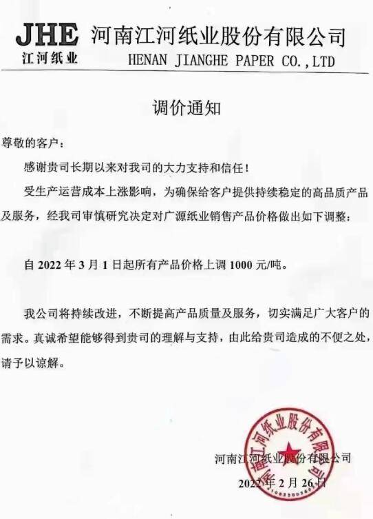 300元/噸的漲幅著實(shí)不小,但考慮到本次山鷹紙業(yè)宣布漲價(jià)的原紙種類多為特種紙,如此漲幅也就不算稀奇。與包裝紙、文化紙不同,特種是具有特殊用途、產(chǎn)量較小的紙張,單價(jià)遠(yuǎn)高于常見(jiàn)的原紙種類,每次的漲幅均在幾百元甚至上千元/噸。 在2月底傳來(lái)的這批漲價(jià)函中,目前漲幅最大的不是山鷹紙業(yè),而是河南的江河紙業(yè)。2月26日,該紙企表示,自3月1日起,旗下廣源紙業(yè)公司的所有產(chǎn)品價(jià)格上調(diào)1000元/噸。 據(jù)了解,河南江河紙業(yè)是成立于2002年,主要從事特種紙和造紙裝備的研發(fā)、生產(chǎn)及銷(xiāo)售,旗下廣源紙業(yè)主打產(chǎn)品包括無(wú)碳紙、熱敏紙、熱升華轉(zhuǎn)印紙、防油紙、離型原紙等,在細(xì)分領(lǐng)域具有較高的市場(chǎng)占有率。