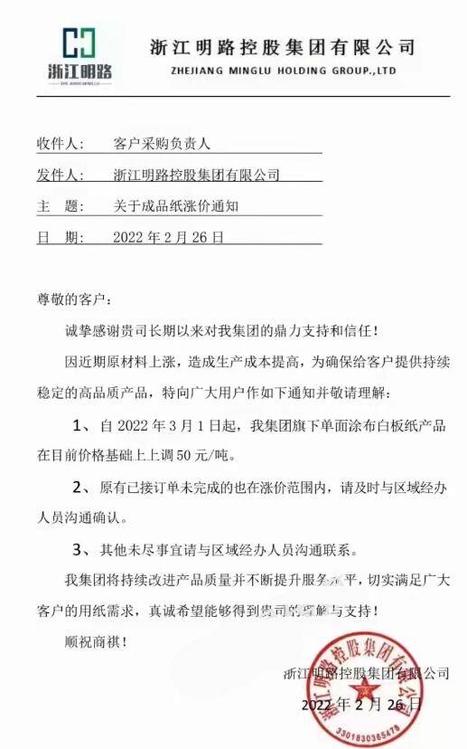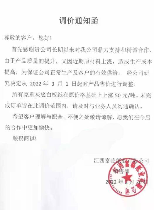 與特種紙相比,包裝類原紙的漲幅明顯不高。3月1日起,江西富臨紙業(yè)所有克重灰底白板紙上調(diào)50元/噸,浙江明路控股集團(tuán)的涂布白板紙亦上調(diào)50元/噸。在最近這段時(shí)間,包裝類原紙漲價(jià)函可能還會(huì)增多,漲幅可能也會(huì)發(fā)生新的變化。 江西富臨紙業(yè)有限公司