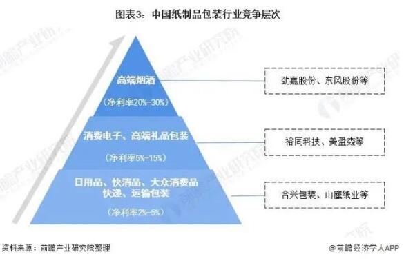 紙包裝市場按照利潤率和規(guī)模體量呈現(xiàn)金字塔狀:金字塔最底層的是工業(yè)包裝及低端商業(yè)包裝,規(guī)模體量最大,原材料以箱板、瓦楞為主,結(jié)構(gòu)簡單個(gè)性化程度低,多用于低客單價(jià)的日用品、快消品、快遞包裝以及部分高客單價(jià)但體積較大的商品(如家電),凈利潤水平約在2%~5%;中高端商業(yè)包裝主要以白卡紙、白板紙等材料為主,印刷精美、結(jié)構(gòu)復(fù)雜、設(shè)計(jì)附加值高,主要用于高客單價(jià)、小體積的商品,如消費(fèi)電子、高端白酒、精品煙盒、高端禮品,其中消費(fèi)電子包裝凈利率多在5%~15%,煙酒包裝凈利潤率可達(dá)20%~30%。