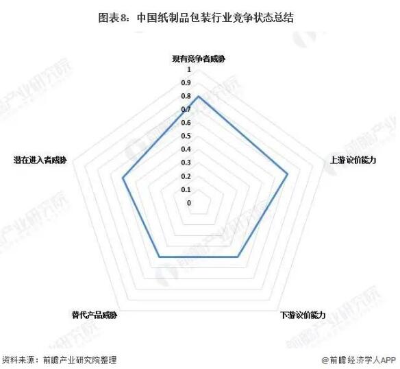 5、中國紙制品包裝行業(yè)競爭狀態(tài)總結(jié) 從五力競爭模型角度分析,目前,國內(nèi)低端紙制品包裝企業(yè)由于企業(yè)規(guī)模小,技術(shù)實(shí)力差,產(chǎn)品檔次較低,產(chǎn)品同質(zhì)化現(xiàn)象嚴(yán)重,相互競爭激烈。 紙制品包裝行業(yè)總體呈現(xiàn)行業(yè)“上游集中,下游分散”的特點(diǎn),上游造紙行業(yè)集中化程度比較高,玖龍紙業(yè)等大型企業(yè)占領(lǐng)了大量市場份額,面對其下游客戶、供應(yīng)商時(shí)議價(jià)能力較強(qiáng),容易將廢紙、煤、淀粉等原材料的價(jià)格風(fēng)險(xiǎn)轉(zhuǎn)嫁給下游包裝企業(yè)。下游行業(yè)覆蓋面廣,幾乎所有的消費(fèi)品制造業(yè)都需要包裝企業(yè)作為供應(yīng)鏈配套環(huán)節(jié),傳統(tǒng)經(jīng)營模式下紙制品包裝行業(yè)幾乎不存在對某特定下游行業(yè)的依賴。 從進(jìn)入壁壘和行業(yè)吸引力兩方面對潛在進(jìn)入威脅進(jìn)行了分析,認(rèn)為隨著我國紙制品包裝行業(yè)標(biāo)準(zhǔn)的提高與競爭層次的上升,我國紙制品包裝行業(yè)進(jìn)入壁壘相應(yīng)提高,但是另一方面,知名企業(yè)取得的巨大成功所帶來的誘惑,也使得許多企業(yè)躍躍欲試,行業(yè)吸引力仍然較強(qiáng)。