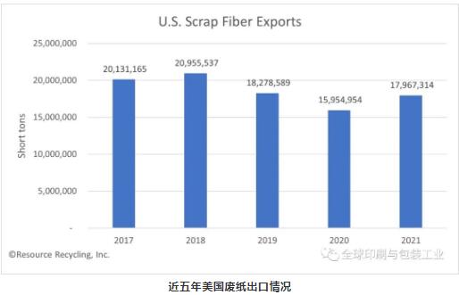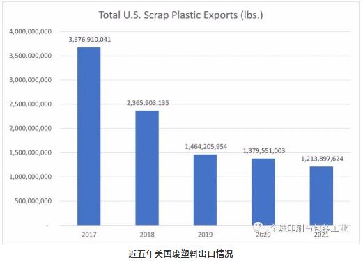 另外,根據美國最新公布的數據顯示,2021年,美國對中國的廢紙出口繼續大幅下降,但世界其他地區的進口量彌補了這一差距。而美國廢塑料的出口量則持續了多年的下降趨勢。數據顯示,2021年美國公司出口了1797萬噸廢紙(包括紙張和紙板),高于上年的1595萬噸,增幅為13%。美國在2021年出口了12.1億磅廢塑料,低于前一年的13.8億磅,或減少了約12%。