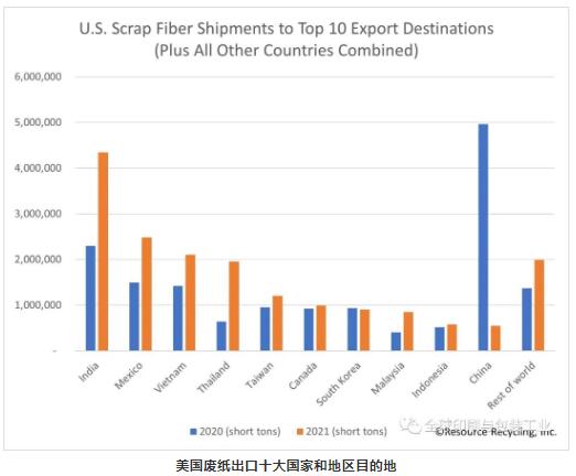 去年在廢紙出口方面,進口美國廢紙的10大國家和地區有較大的變動,更多的廢紙出口到了泰國(增長203%)、馬來西亞(增長109%)、印度(增長89%)、墨西哥(增 66%)、越南(增長48%)、中國臺灣(增長26%)、印度尼西亞(增長11 %)和加拿大(增長7%)。所有其他國家和地區加起來的廢紙進口增加了45%。