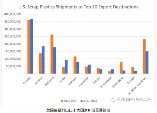 其他國家和地區大幅削減了從美國進口的數量,包括中國香港(下降72%)、中國臺灣(下降56%)、馬來西亞(下降32%)、越南(下降31%)和土耳其(下降24%)。未進入2021年前10名的所有其他國家和地區的總和下降了35%。到目前為止,加拿大仍然是廢塑料的最大進口國。在馬來西亞新政實施后,加拿大從2019年開始躍居第一。