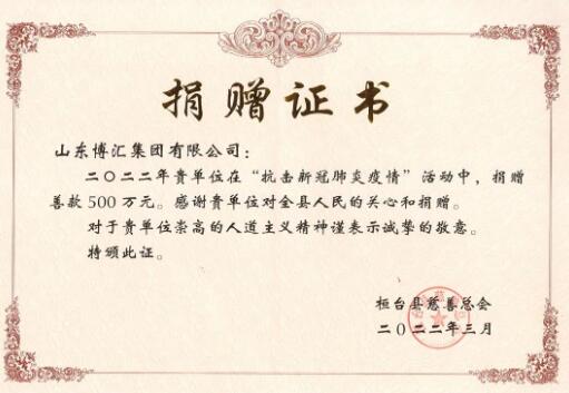 疫情面前顯擔當。3月17日,博匯集團向山東省淄博市桓臺縣慈善總會捐款500萬元,助力桓臺縣抗擊防控新冠疫情,體現了企業的責任和擔當。