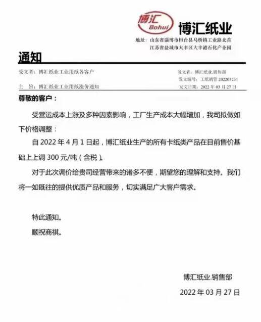博匯紙業 4月1日日,所有卡紙類產品在目前售價基礎上上漲300元/噸。