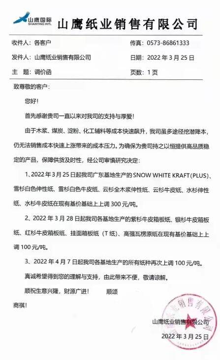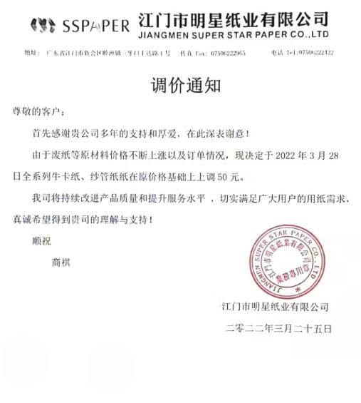 從3月25日開始,市場上關于紙價上漲的消息就已傳得沸沸揚揚。玖龍紙業、山鷹國際、東莞建暉紙業等瓦楞、箱板紙巨頭,APP金光紙業、晨鳴紙業、博匯紙業等白卡紙大廠,均在3月份最后幾天宣布漲價,幅度為50-300元/噸。 包裝紙巨頭相繼宣布漲價 3月25日,玖龍紙業提前喊漲,其東莞基地的地龍及江龍牌再生牛卡紙、太倉基地的江龍牌瓦楞紙和再生牛卡紙,均在3月28日起漲價50元/噸。盡管本次漲幅相對溫和,但無疑給市場傳遞出看漲信號,在包裝行業引起較大反響。 與此同時,國內包裝紙行業另一巨頭山鷹國際亦發布漲價函,宣布廣東基地的特種紙產品在3月25日上漲300元/噸,各基地的包裝紙產品在3月28日上漲100元/噸,所有基地的所有紙種在4月7日再次上漲100元/噸。具體如下: 3月25日起,廣東基地生產的SNOW WHITE KRAFT(PLUS)、雪杉白色伸性紙、雪杉白色牛皮紙、云杉全木漿伸性紙、云杉牛皮紙、水杉伸性紙、水杉牛皮紙在現有基價基礎上上調300元/噸; 3月28日起,各基地生產的紫杉牛皮箱板紙、銀杉牛皮箱板紙、紅杉牛皮箱板紙、掛面箱板紙(T紙)、高強瓦楞原紙在現有基價基礎上上調100元/噸。 4月7日起,各基地生產的所有紙種再次上調100元/噸。