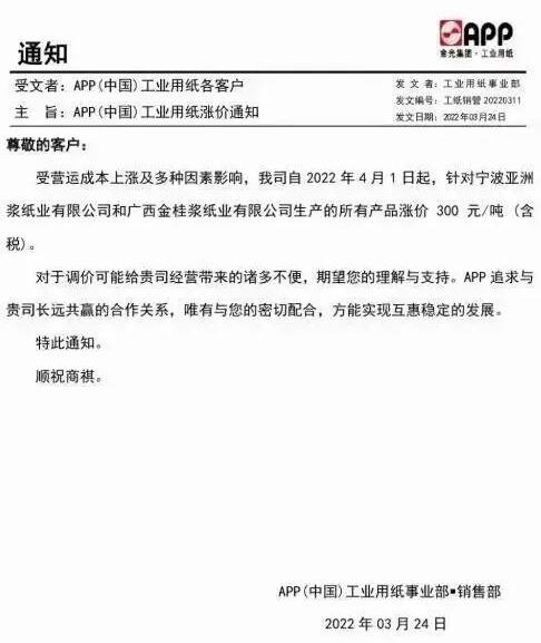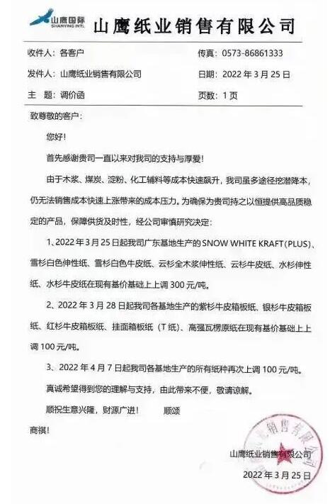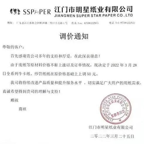 原材料價格持續上漲,包裝紙大廠集體提價 近幾日,紙業市場迎來一絲回暖跡象!據華印小編了解:山鷹國際、世紀陽光、明星紙業、建暉紙業、APP等多家大廠開始提價,漲幅在50-300元/噸,涉及白板紙、箱板紙、紗管紙、牛皮紙等多個紙種。 山鷹紙業:上調100-300元/噸