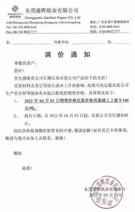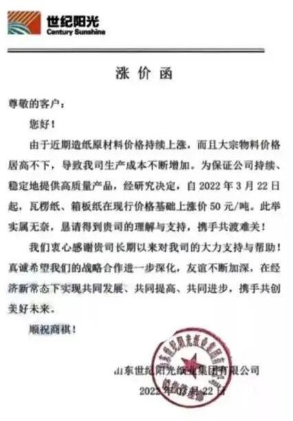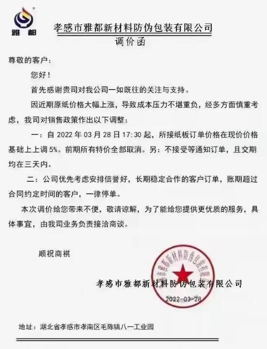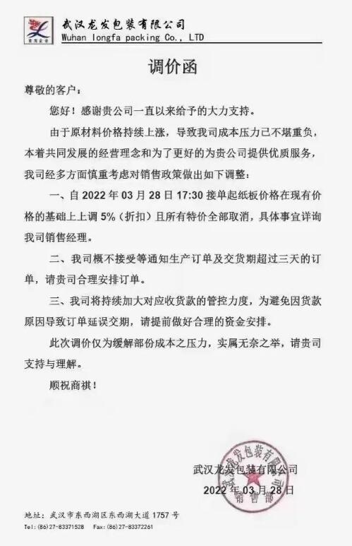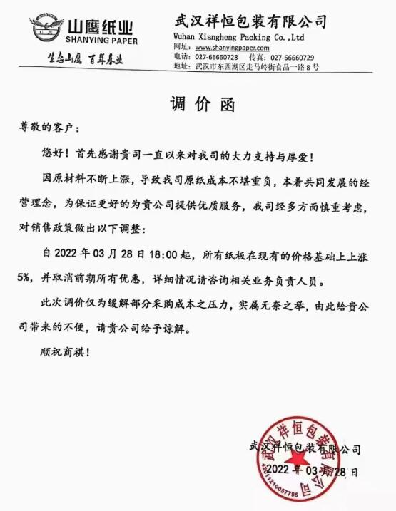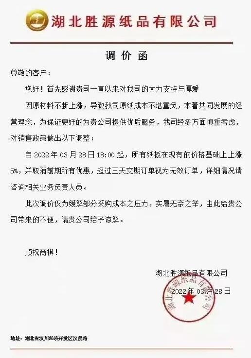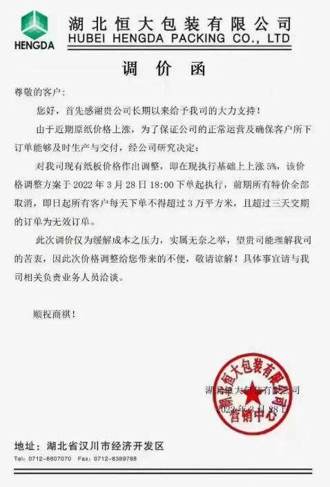 另據下游客戶反映,近期多家紙企亦將集中上調白卡紙價格。其中,晨鳴紙業、博匯紙業均計劃統一提價300元/噸,將于4月1日執行。萬國紙業、金光紙業也有相關調價計劃。此輪白卡紙廠家提價的主要原因系近期木漿價格的持續上行,據悉部分木漿產品現貨價格較年初上漲了20%以上。 湖北多家龍頭紙板廠集體漲價5% 隨著原紙價格的上調,部分地區紙板價格也應聲上漲。例如,湖北市場恒大包裝、武漢龍發、勝源紙品、武漢祥恒、勤善美瓦楞紙品、孝感雅都等多家規模紙板廠均加入漲價隊伍,漲幅在5%左右。 關于漲價原因,各企業口徑非常統一,均將矛頭直指原材料價格的持續上行,給公司生產經營帶來了不可承受的成本壓力。