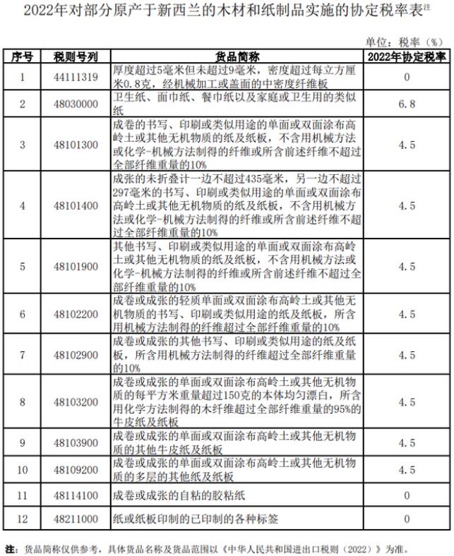 為履行《升級(jí)議定書(shū)》及相關(guān)換文規(guī)定,國(guó)務(wù)院關(guān)稅稅則委員會(huì)發(fā)布公告,自4月7日起對(duì)部分原產(chǎn)于新西蘭的木材和紙制品稅目實(shí)施協(xié)定稅率,后續(xù)年度稅率自當(dāng)年1月1日起實(shí)施。
