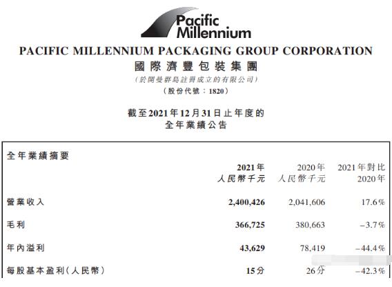 日前,國際濟豐包裝集團公布了2021年全年業績,實現營業收入24億元,同比增加17.6%。但受各方面成本持續上漲所致,國際濟豐包裝集團2021年的純利較2020年同比減少約44.4%,為4363萬元。