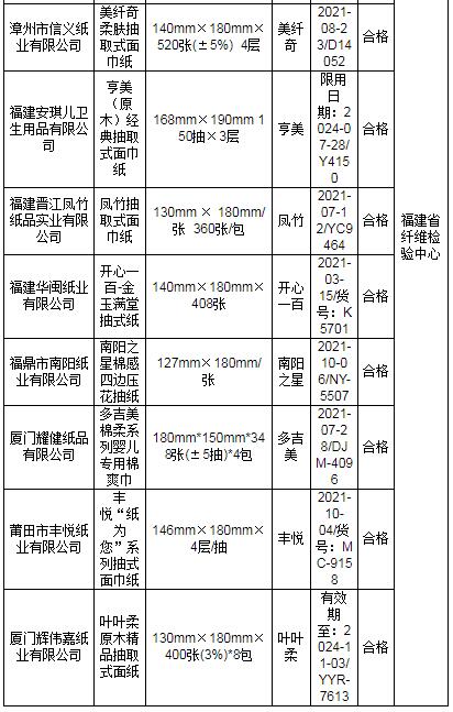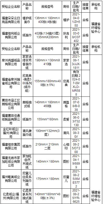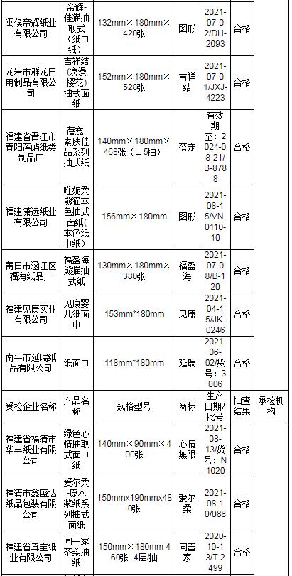 近期,依據(jù)《中華人民共和國產(chǎn)品質(zhì)量法》,福建省市場監(jiān)督管理局組織對紙巾紙產(chǎn)品質(zhì)量開展省級監(jiān)督抽查。本次共抽查30家生產(chǎn)企業(yè)生產(chǎn)的30批次產(chǎn)品,其中1批次不合格,不合格發(fā)現(xiàn)率為3.3%。 本次抽查依據(jù)GB 15979-2002 《一次性使用衛(wèi)生用品衛(wèi)生標(biāo)準(zhǔn)》、GB/T 20808-2011 《紙巾紙》、QB/T 4509-2013 《本色生活用紙》等標(biāo)準(zhǔn)要求,對細(xì)菌菌落總數(shù)、大腸菌群、綠膿桿菌、金黃色葡萄球菌、溶血性鏈球菌、真菌菌落總數(shù)、亮度(白度)、可遷移性熒光增白劑、灰分、橫向吸液高度、橫向抗張指數(shù)、縱向濕抗張強度、柔軟度等13個項目進(jìn)行檢驗。其中發(fā)現(xiàn)不合格項目為縱向濕抗張強度。 省市場監(jiān)管局已責(zé)成市市場監(jiān)管局對本次抽查不合格產(chǎn)品及其生產(chǎn)企業(yè)依法予以處理。 表1 福建省紙巾紙產(chǎn)品質(zhì)量省級監(jiān)督抽查結(jié)果(合格)