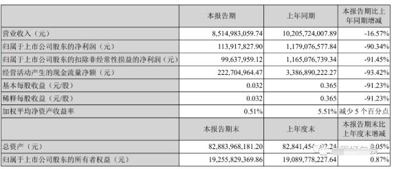 晨鳴紙業一季度營業收入85.15億元,同比下降16.57%,凈利潤同比下滑90.34%至1.13億元。